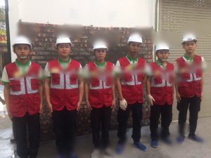 こちらは技能実習生の現場実習の制服です。安全のためにヘルメットを着用しています。