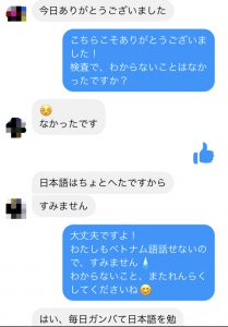 私は、ベトナム語を話すことは出来ませんが、翻訳のアプリを使って対応させていただきました。